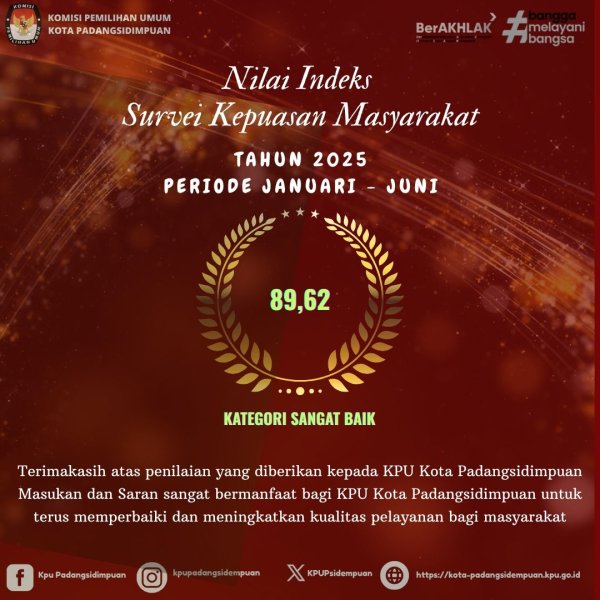 KPU Kota Padangsidimpuan meraih Nilai Indeks Kepuasan Masyarakat (IKM) Tahun 2025 sebesar 89,62 dengan kategori Sangat Baik . Capaian ini menjadi motivasi bagi Komisi Pemilihan Umum Kota Padangsidimpuan untuk terus meningkatkan kualitas pelayanan kepada masyarakat.