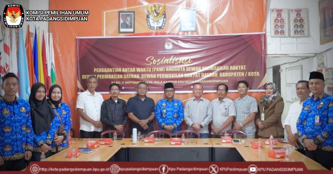 Komisi Pemilihan Umum Kota Padangsidimpuan laksanakan Rapat Koordinasi/ Sosialisasi Mekanisme & Kebijakan Penggantian Antar Waktu (PAW) Anggota DPR, DPD, DPRD Provinsi dan DPRD Kabupaten/Kota, acara dilaksanakan pada hari Rabu, 17 September 2025 di Aula Kantor KPU Kota Padangsidimpuan.
