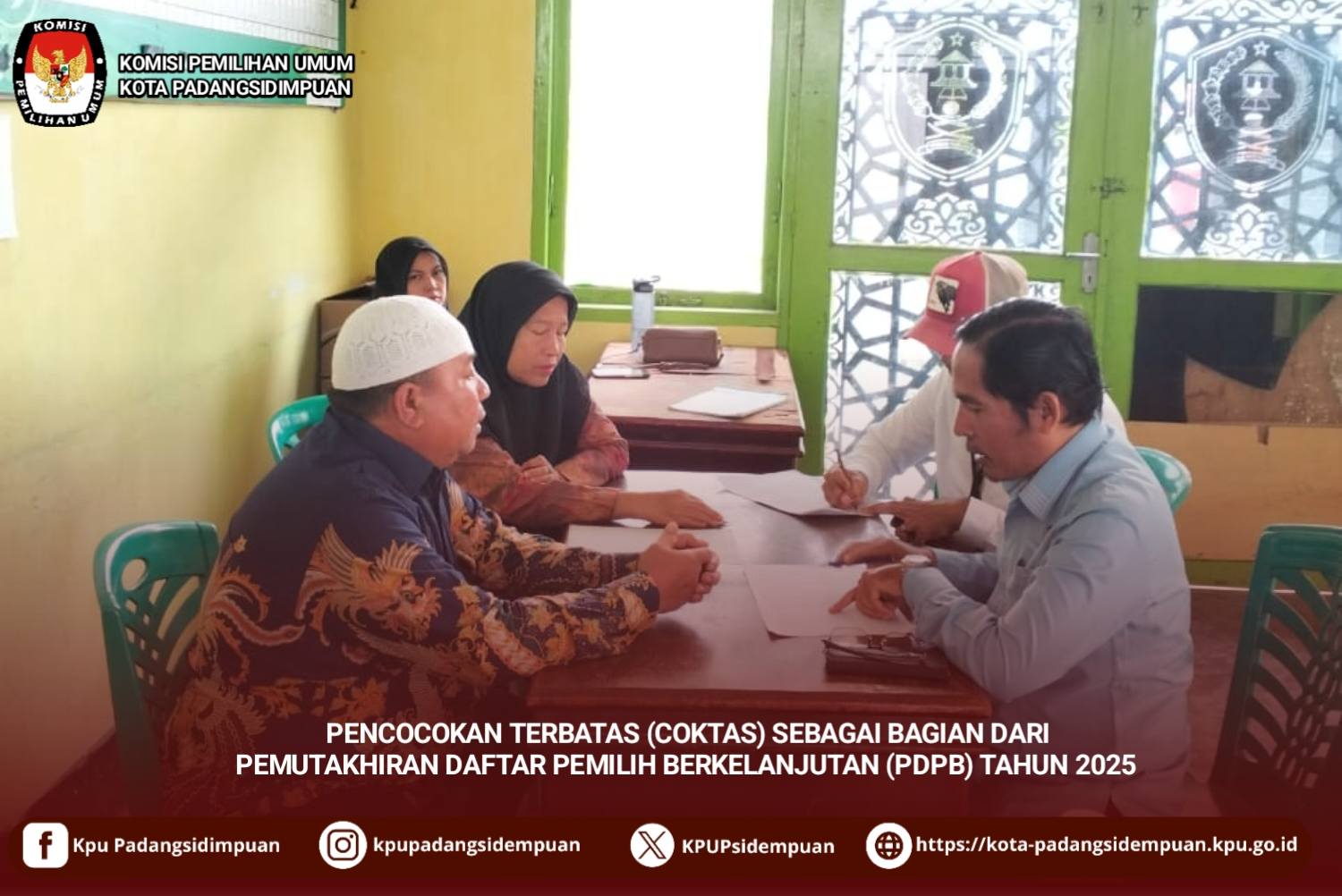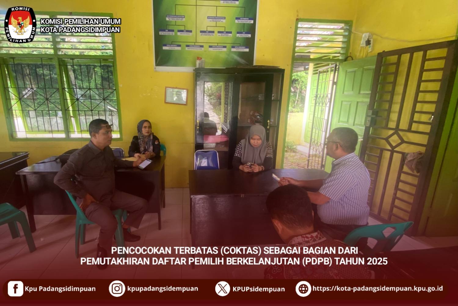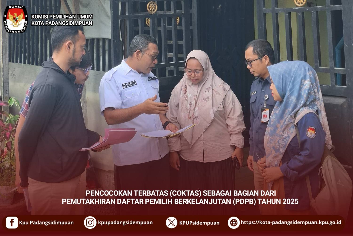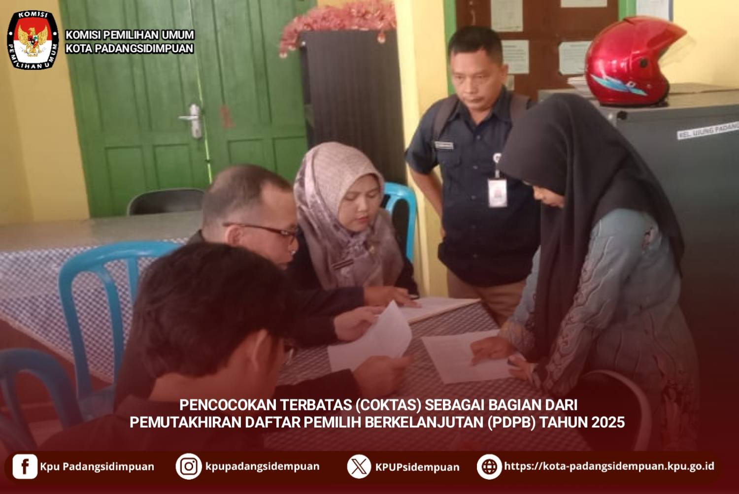 #TemanPemilih, KPU Kota Padangsidimpuan melaksanakan kegiatan Pencocokan Terbatas (COKTAS) sebagai bagian dari Pemutakhiran Daftar Pemilih Berkelanjutan (PDPB) Tahun 2025.