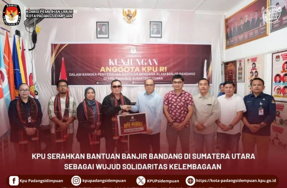 Komisi Pemilihan Umum (KPU) menyerahkan bantuan kemanusiaan kepada korban bencana alam banjir bandang yang melanda wilayah Sumatera Utara. Penyerahan bantuan tersebut dilaksanakan di Kantor KPU Kota Padangsidimpuan, Sumatera Utara, pada Minggu (11/1/2026).