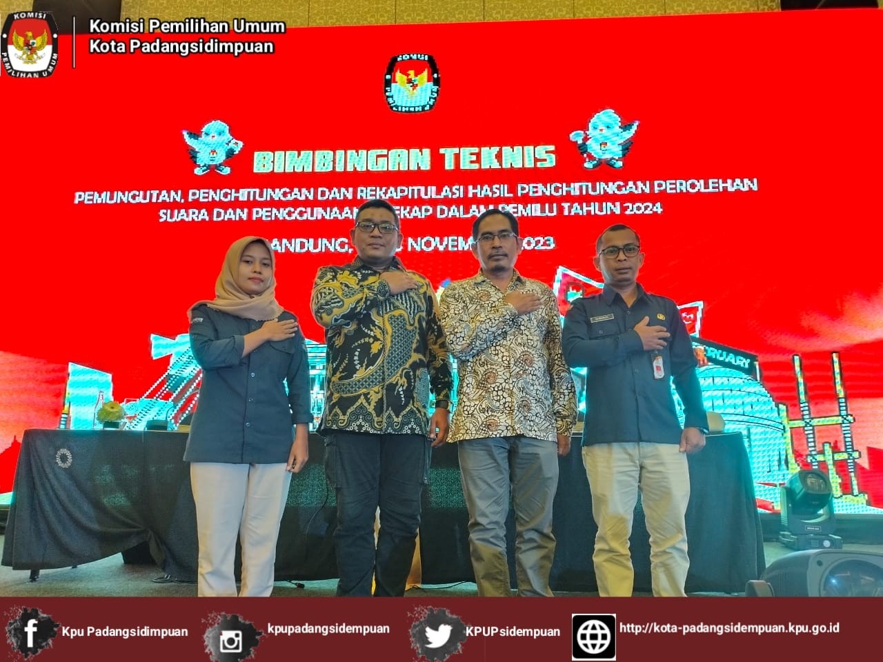 #TemanPemilih, dalam rangka persamaan persepsi dan memberikan pemahaman regulasi serta kebijakan tentang Pemungutan, Perhitungan dan Rekapitulasi Hasil Perhitungan, Perolehan Suara Serta Penggunaan Aplikasi Sistem Informasi Rekapitulasi (SIREKAP) dalam Pemilu Tahun 2024, untuk itu Koordinator Divisi Teknis Penyelenggaraan Fadlyka Himmah Syahputera Harahap, Koordinator Divisi Perencanaan Data dan Informasi Usman Riharnol Siskandra Siregar, Operator SIDALIH Edi Wanra dan Operator SIREKAP Maimunah mengikuti Bimbingan Teknis Pemungutan, Perhitungan dan Rekapitulasi Hasil Perhitungan Perolehan Suara serta Penggunaan Sistem Informasi Rekapitulasi (SIREKAP) dalam Pemilu 2024. Acara dilaksanakan di The Trans Luxury Hotel, Jln. Gatot Subroto, No. 289, Cibangkong, Kecamatan Batununggal, Kota Bandung, Jawa Barat mulai tanggal 25-28 November 2023.