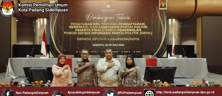 Komisi Pemilihan Umum Kota Padang Sidempuan mengikuti Bimbingan Teknis (Bimtek) Peraturan KPU tentang Pendaftaran, Verifikasi dan Penetapan Partai Politik Peserta Pemilu serta Pengenalan Fungsi Sistem Informasi Partai Politik (SIPOL) Pemilu Tahun 2024 dilaksanakan dari tanggal 23 - 25 Juli 2022 di Hotel Grand Mercure Harmoni Jakarta.