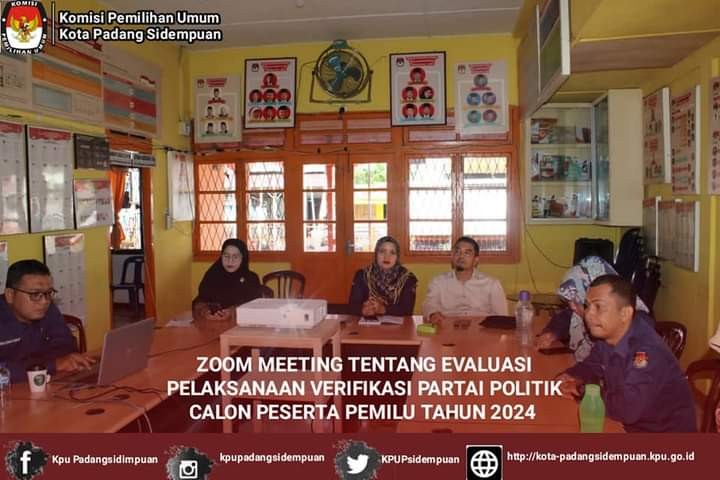 #TemanPemilih, Plh. Ketua KPU Kota Padang Sidempuan Fadlyka Himmah Syahputera Harahap bersama Ketua Divisi Hukum dan Pengawasan Ahmad Rasid, Ketua Divisi Sosdiklih, Parmas dan SDM Nurhamidah Pulungan, Sekretaris KPU Kota Padang Sidempuan Deka Ria Murti Lubis, serta Verifikator Partai Politik KPU Kota Padang Sidempuan mengikuti zoom meeting tentang Evaluasi Pelaksanaan Verifikasi Partai Politik Calon Peserta Pemilu Tahun 2024 yang diselenggarakan oleh KPU Provinsi Sumatera Utara pada hari Selasa, 23 Agustus 2022 pukul 09:30 WIB.