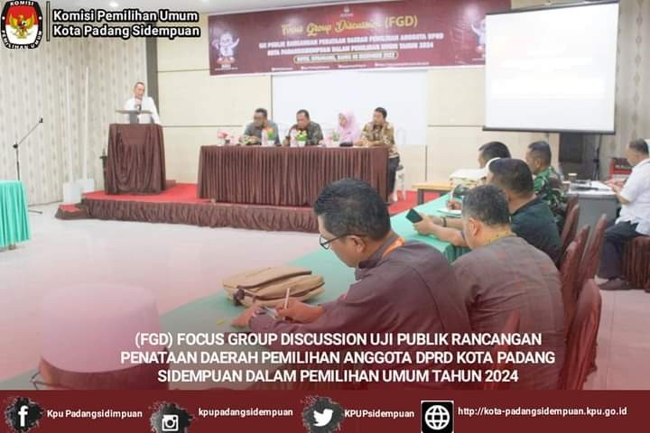 #TemanPemilih, Komisi Pemilihan Umum Kota Padang Sidempuan menyelenggarakan (FGD) Focus Group Discussion Uji Publik Rancangan Penataan Daerah Pemilihan Anggota DPRD Kota Padang Sidempuan Dalam Pemilihan Umum Tahun 2024. Hadir pada kegiatan tersebut Walikota Padang Sidempuan Irsan Efendi Nasution, Forum Komunikasi Pimpinan Daerah, Ketua Bawaslu, Pimpinan OPD, Akademisi, Tokoh Masyarakat, Organisasi Kemahasiswaan dan Organisasi Perempuan se-Kota Padang Sidempuan, Kamis 8 Desember 2022