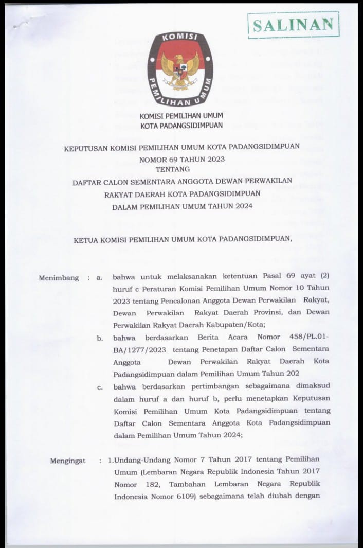 Keputusan KPU Kota Padangsidimpuan terkait Daftar Calon Sementara (DCS) Anggota Dewan Perwakilan Rakyat Daerah Kota Padangsidimpuan dalam Pemilihan Tahun 2024