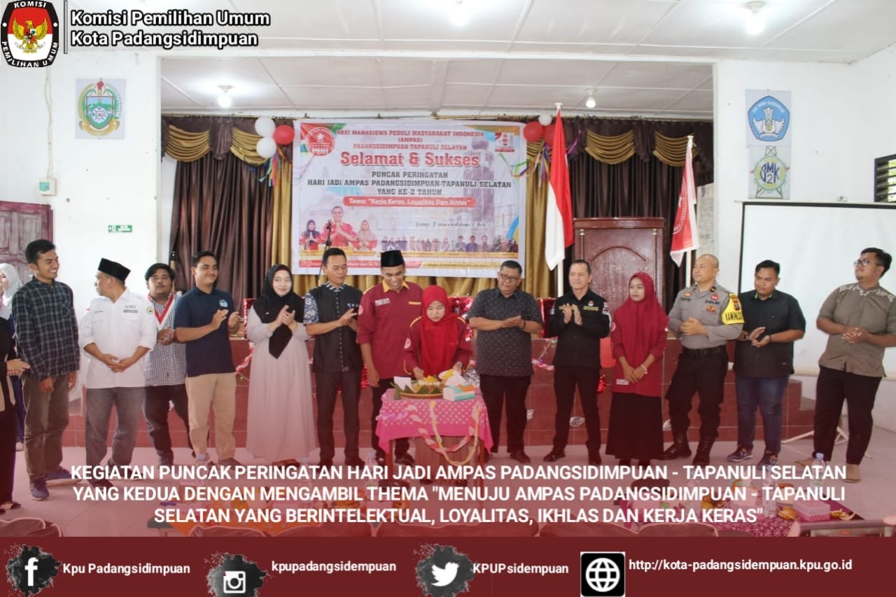 #TemanPemilih, Ketua KPU Kota Padangsidimpuan Tagor Dumora Lubis menghadiri kegiatan Puncak Peringatan Hari Jadi Ampas Padangsidimpuan - Tapanuli Selatan yang kedua dengan mengambil thema "Menuju Ampas Padangsidimpuan - Tapanuli Selatan yang Berintelektual, Loyalitas, Ikhlas dan Kerja Keras". Peringatan hari jadi Aksi Mahasiswa Peduli Masyarakat Indonesia yang kedua ini dihadiri oleh perwakilan Pemerintah Kota Padangsidimpuan, Pemerintah Kabupaten Tapanuli Selatan, Kapolres Tapanuli Selatan atau yang mewakili dan Organisasi Kemahasiswaan. Puncak kegiatan ditandai dengan pemotongan nasi tumpeng dan pemberian santunan kepada anak yatim - piatu, Aula MAN 2 Padangsidimpuan 26 November 2023.
