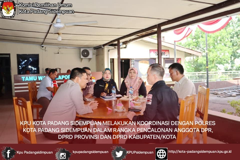 Sehubungan dengan hal tersebut Ketua KPU Kota Padang Sidempuan Tagor Dumora Lubis, Ketua Divisi Teknis Penyelenggaraan Fadlyka Himmah Syahputera Harahap, Kasubbag Teknis dan Hupmas Annur Rasyidah Siregar dan Operator Silon KPU Kota Padang Sidempuan Armina Safitri melakukan Kunjungan Koordinasi dengan Kepolisian Resort Kota Padang Sidempuan terkait Tahapan Pencalonan Anggota DPR, DPRD Provinsi dan DPRD Kabupaten/Kota serta Kelengkapan Administrasi Pencalonan Anggota DPRD Kota Padang Sidempuan (Sesuai Peraturan Komisi Pemilihan Umum Nomor 10 Tahun 2023 bahwa masa pengajuan Bakal calon Anggota Dewan Perwakilan Rakyat Daerah Kabupaten/Kota Pada Pemilu tahun 2024 mulai tanggal 1 s/d 14 Mei 2023)