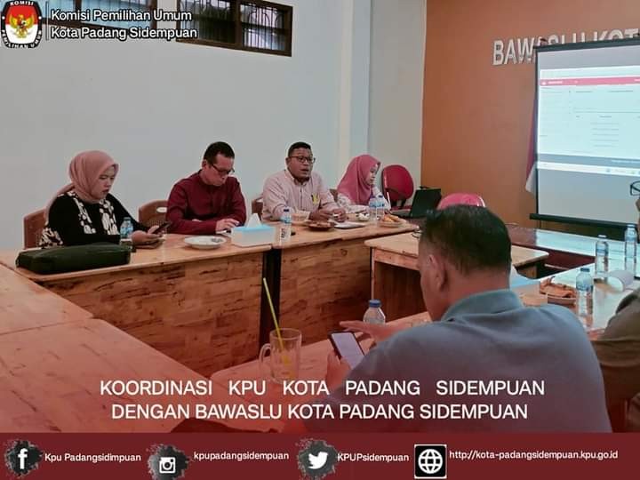 Ketua KPU Kota Padang Sidempuan Tagor Dumora Lubis bersama Divisi Teknis Penyelenggaraan Fadlyka Himmah Syahputera Harahap, Kasubbag Teknis & Hub Parmas Annur Rasyidah Siregar beserta Operator Maimunah Batubara lakukan koordinasi dengan Ketua dan Anggota Bawaslu Kota Padang Sidempuan terkait Tahapan Pencalonan Perseorangan Peserta Pemilihan Umum Anggota Dewan Perwakilan Daerah (DPD) dan akses pada Sistem Informasi Pencalonan (SILON) DPD untuk Bawaslu Kab/Kota.