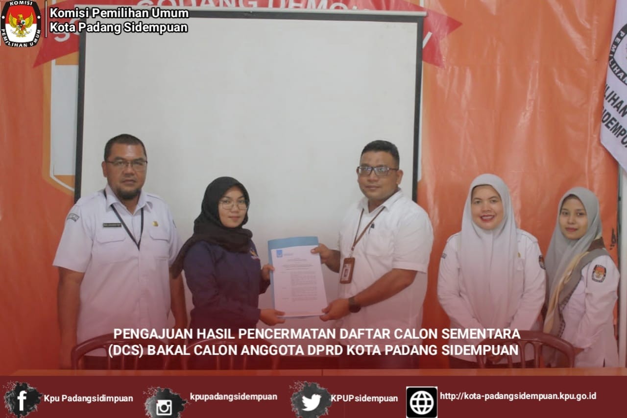 KPU Kota Padang Sidempuan menerima Pengajuan Hasil Pencermatan Daftar Calon Sementara (DCS) Bakal Calon Anggota DPRD Kota Padang Sidempuan oleh Partai Nasdem pada hari Kamis, 10 Agustus 2023 bertempat di Aula Kantor KPU Kota Padang Sidempuan.