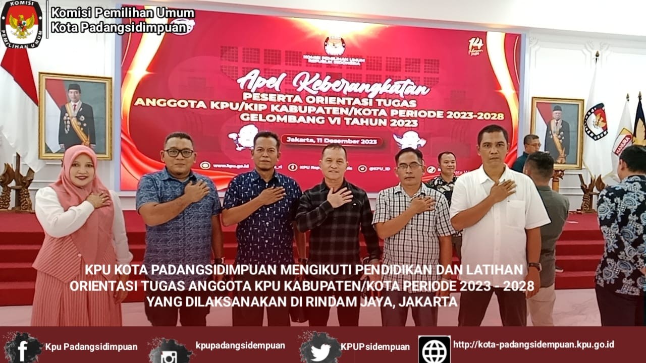 #TemanPemilih, Ketua dan Anggota KPU Kota Padangsidimpuan bersama Sekretaris KPU Kota Padangsidimpuan mengikuti Pendidikan dan Latihan Orientasi Tugas Anggota KPU Kabupaten/Kota Periode 2023 - 2028 yang dilaksanakan di Rindam Jaya, Jakarta. Orientasi Tugas ini bertujuan untuk menumbuhkan dan meningkatkan Integritas, Loyalitas, Soliditas dan Profesionalitas Penyelenggara Pemilu dalam Penyelenggaraan Pemilu Tahun 2024 yang diikuti oleh 270 Anggota KPU Kabupaten/Kota termasuk 26 Satker KPU Kabupaten/Kota di Provinsi Sumatera Utara, Rindam Jaya Jakarta 11 s/d 15 Desember 2023.
