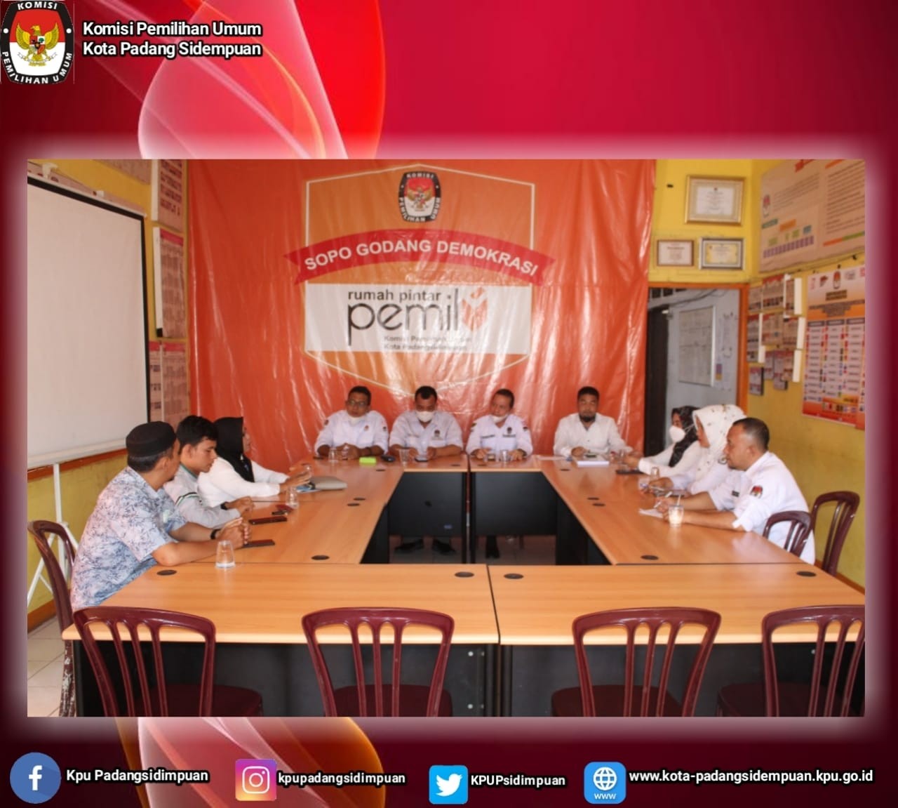 Ketua KPU Kota Padang Sidempuan Tagor Dumora Lubis bersama Ketua Divisi Hukum dan Pengawasan Ahmad Rasid, Ketua Divisi Teknis Penyelenggaraan Fadlyka Himmah Syahputera Harahap, Ketua Divisi Perencanaan dan Data Afwan Hasibuan, Sekretaris Deka Ria Murti Lubis, Kasubbag Teknis dan Hupmas Annur Rasyidah, Kasubbag Hukum dan Pengawasan Sahlan Basri, Kasubbag Keuangan Umum dan Logistik Sutan, Kasubbag Perencanaan dan Data Suryani Ramlah Siregar, menerima kunjungan dari DPD Partai Gelora Kota Padang Sidempuan dalam rangka Silaturrahmi, konsultasi dan koordinasi terkait Persiapan Partai Politik menyongsong Tahapan Pemilihan Umum Tahun 2024.