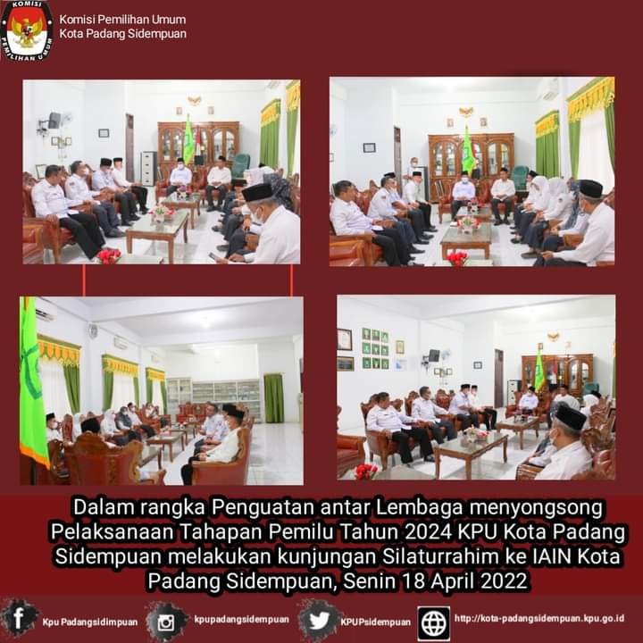 #TemanPemilih, Dalam rangka Penguatan antar Lembaga menyongsong Pelaksanaan Tahapan Penyelenggaraan Pemilihan Umum Tahun 2024 Ketua KPU Kota Padang Sidempuan Tagor Dumora Lubis bersama Komisioner Divisi Perencanaan Data dan Informasi Afwan Hasibuan, Divisi Teknis dan Penyelenggaraan Fadlyka Himmah Syahputera Harahap, Divisi Sosdiklih, Parmas dan SDM Nurhamidah Pulungan, Kasubbag Perencanaan Data dan Informasi Suryani Ramlah serta Kasubbag Teknis dan Penyelenggaraan Annur Rasyidah melakukan kunjungan Silaturrahim ke IAIN Kota Padang Sidempuan yang diterima langsung oleh Rektor IAIN Kota Padang Sidempuan Dr. H. Muhammad Darwis Dasopang, M. A, didampingi oleh Wakil Rektor I Bidang Akademik dan Pengembangan Lembaga, Dr. Erawadi, M. Ag, Wakil Rektor III Bidang Kemahasiswaan Alumni dan Kerjasama, Dr. Ikhwanuddin, M. Ag, Kepala Sub Kordinator pada Sub Bagian Humas dan Informasi, Ratonggi Hasibuan, M. A, pengelola administrasi Subbag Humas dan Informasi pada bagian umum dan informasi, Subroto, S. Pd, Dalam pertemuan ini ada 2 poin yang akan ditindak lanjuti nantinya yang diawali penanda tanganan MOU antara KPU Kota Padang Sidempuan dan IAIN Kota Padang Sidempuan. Yang pertama melakukan Sosialisasi terkait pendaftaran sebagai pemilih melalui aplikasi Sidarlih bagi seluruh Dosen dan Mahasiswa di lingkungan IAIN Kota Padang Sidempuan. Yang kedua Sosialisasi Seputar Pemilu dan Pemilihan Serentak Tahun 2024, Senin 18 April 2022.