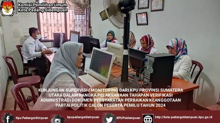 #TemanPemilih, Kamis Tanggal 6 Oktober 2022 KPU Kota Padang Sidempuan menerima Kunjungan Supervisi / Monitoring dari KPU Provinsi Sumatera Utara yang dihadiri oleh Ibu Kartinawati Harahap, Evi Ratimah Tim Verifikator Provinsi. Dalam rangka pelaksanaan Tahapan Verifikasi Administrasi dokumen persyaratan perbaikan Keanggotaan Partai Politik Calon Peserta Pemilu Tahun 2024.