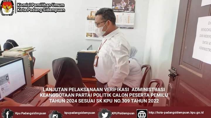 #TemanPemilih, KPU Kota Padang Sidempuan melanjutkan pelaksanaan Verifikasi Administrasi Keanggotaan Partai Politik Calon Peserta Pemilu Tahun 2024 sesuai SK KPU No.309 Tahun 2022.