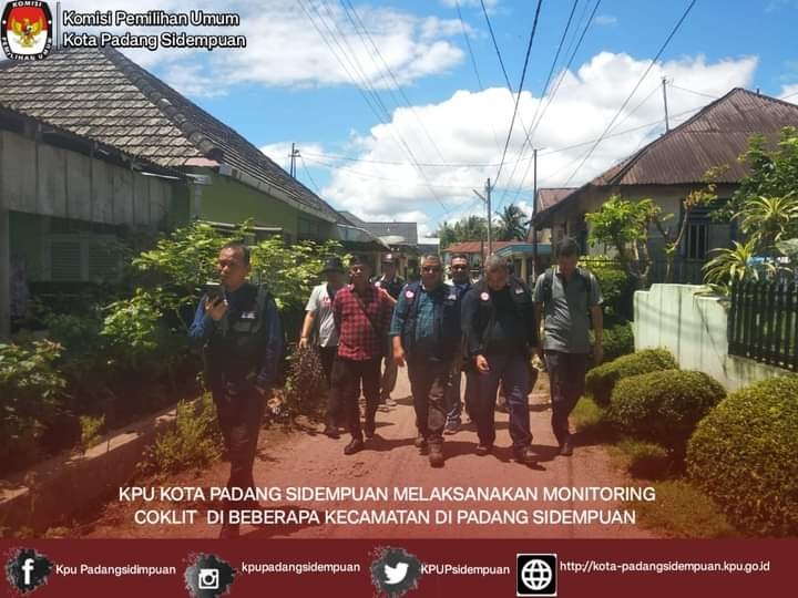 #TemanPemilih, KPU Kota Padang Sidempuan melaksanakan monitoring Coklit di beberapa Kecamatan di Padang Sidempuan turut hadir Anggota KPU Provinsi Sumatera Utara (Divisi Perencanaan Data dan Informasi) Yulhasni didampingi oleh Ketua KPU Kota Padang Sidempuan (Tagor Dumora) Divisi Perencanaan Data dan Informasi (Afwan Hasibuan), Divisi Teknis Penyelenggaraan (Fadlyka Himmah Syahputera Harahap) serta PPK dan PPS Kota Padang Sidempuan di masing-masing Kecamatan.