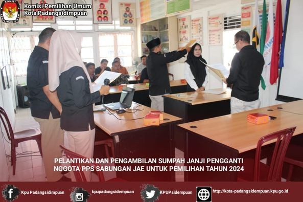 #TemanPemilih, Komisi Pemilihan Umum Kota Padangsidimpuan melaksanakan Pelantikan dan Pengambilan Sumpah Janji Pengganti Anggota PPS Sabungan Jae untuk Pemilihan Tahun 2024, yang dilaksanakan di Aula Kantor KPU Kota Padangsidimpuan pada hari Rabu, 5 Juni 2024 mulai Pukul 14.00s/d Selesai.