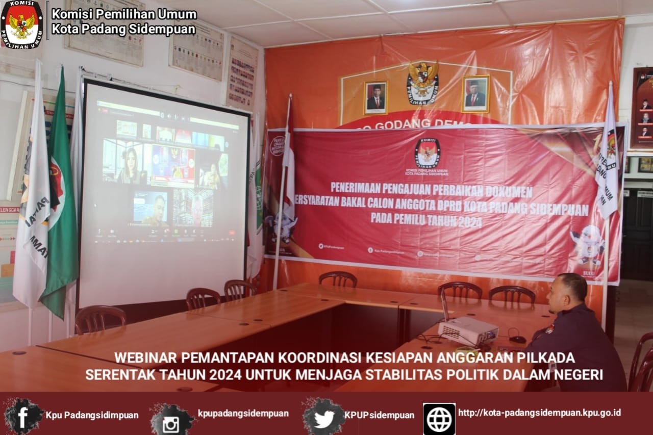 #TemanPemilih, dalam rangka mendukung kelancaran persiapan pelaksanaan pemilihan Kepala Daerah Serentak Tahun 2024, KPU Kota Padangsidimpuan mengikuti webinar dengan tema "Pemantapan Koordinasi Kesiapan Anggaran Pilkada Serentak Tahun 2024 Untuk Menjaga Stabilitas Politik Dalam Negeri" yang diselenggarakan oleh Direktorat Jenderal Politik dan Pemerintahan Umum pada hari Selasa, 18 Juli 2023 mulai pukul 08.00 WIB s.d selesai.