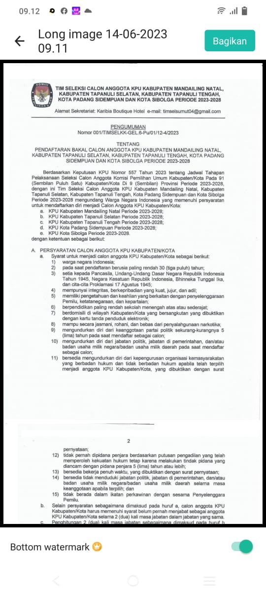 Beedasarkan Pengumuman Nomor : 001/TIMSELKK-GEL.6-Pu/01/12-4/2023 Tentang Pendaftaran Bakal Calon Anggota KPU Kabupaten Mandailing Natal, Kabupaten Tapanuli Selatan, Kabupaten Tapanuli Tengah, Kota Padang Sidempuan dan Kota Sibolga Periode 2023-2028>>>klik disini
