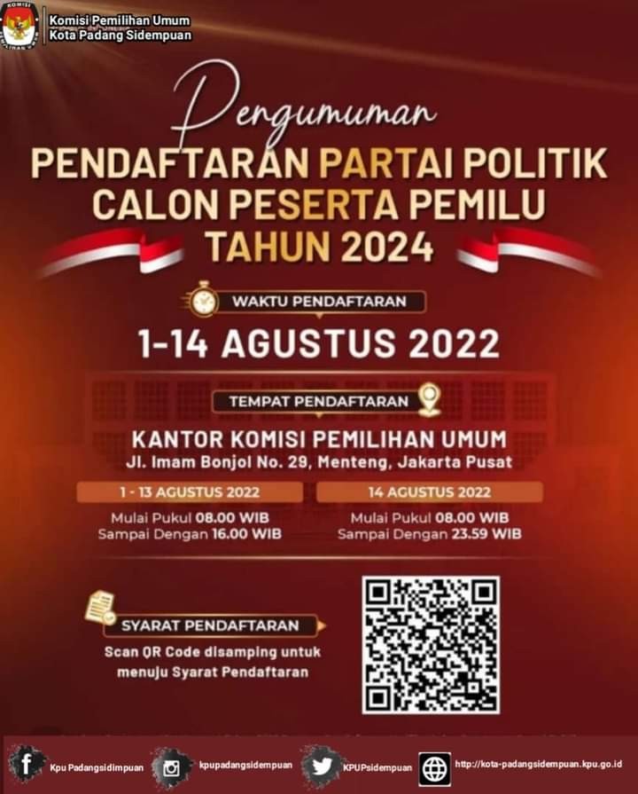 #TemanPemilih, Sesuai dengan PKPU Nomor 3 Tahun 2022 tentang Tahapan dan Jadwal Penyelenggaraan Pemilihan Umum Tahun 2024, pada hari ini Jum'at 29 Juli 2022 sampai dengan Minggu 31 Juli 2022 KPU Republik Indonesia mengumumkan Pendaftaran Partai Politik yang nantinya akan ditetapkan sebagai Peserta Pemilihan Umum Tahun 2024. Pendaftaran Partai Politik ini akan dimulai pada tanggal 1 Agustus 2022 sampai dengan 14 Agustus 2022, Jum'at 29 Juli 2022