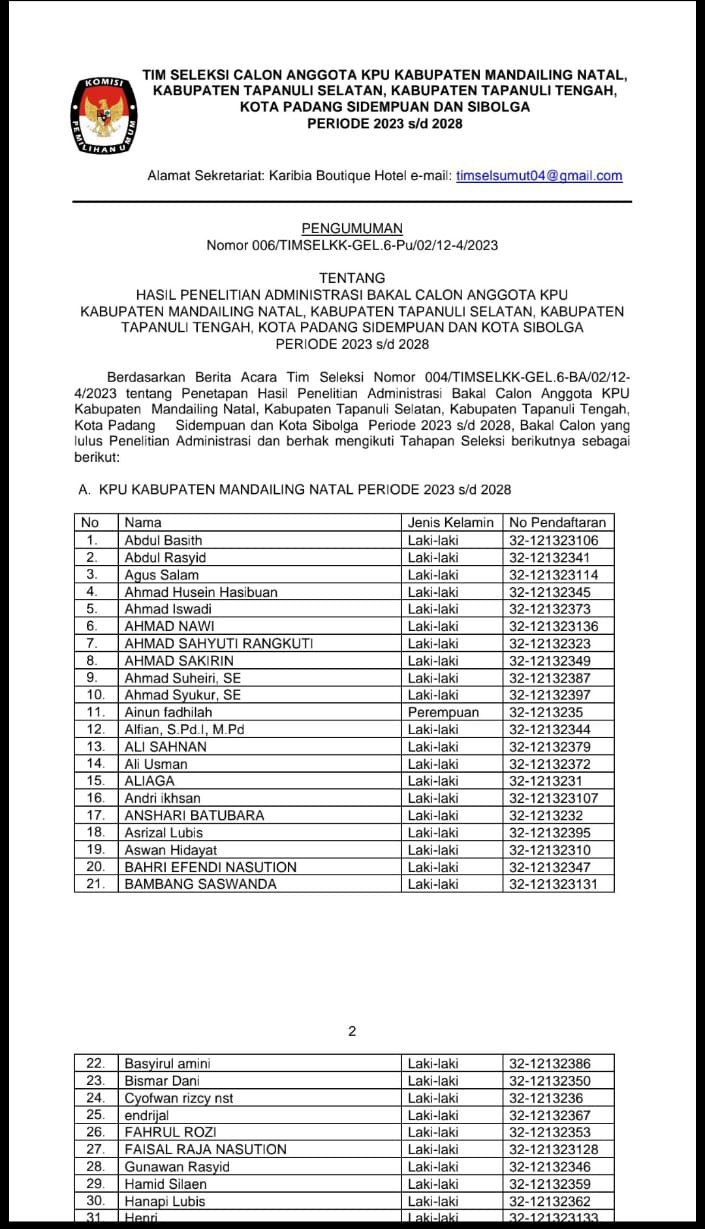 Pengumuman Hasil Penelitian Administrasi Bakal Calon Anggota KPU Kabupaten Mandailing Natal, Kabupaten Tapanuli Selatan, Kabupaten Tapanuli Tengah, Kota Padang Sidempuan dan Kota Sibolga