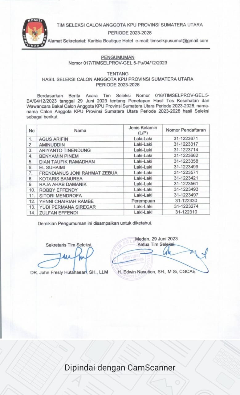 Pengumuman Hasil Seleksi Calon Anggota KPU Provinsi Sumatera Utara Periode 2023-2028