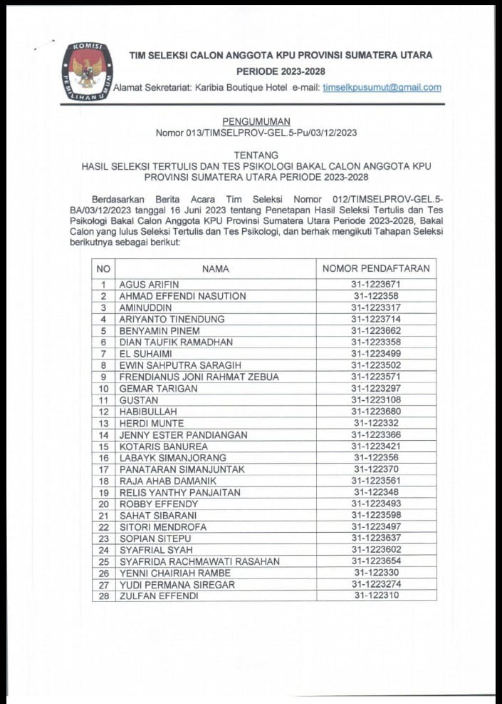 Pengumumuman Nomor : 013/TIMSELPROV-GEL.5-Pu/03/12/2023 Tentang Hasil Seleksi Tertulis dan Tes Psikologi Bakal Calon Anggota KPU Provinsi Sumatera Utara Periode 2023-2028 >>>klik disini
