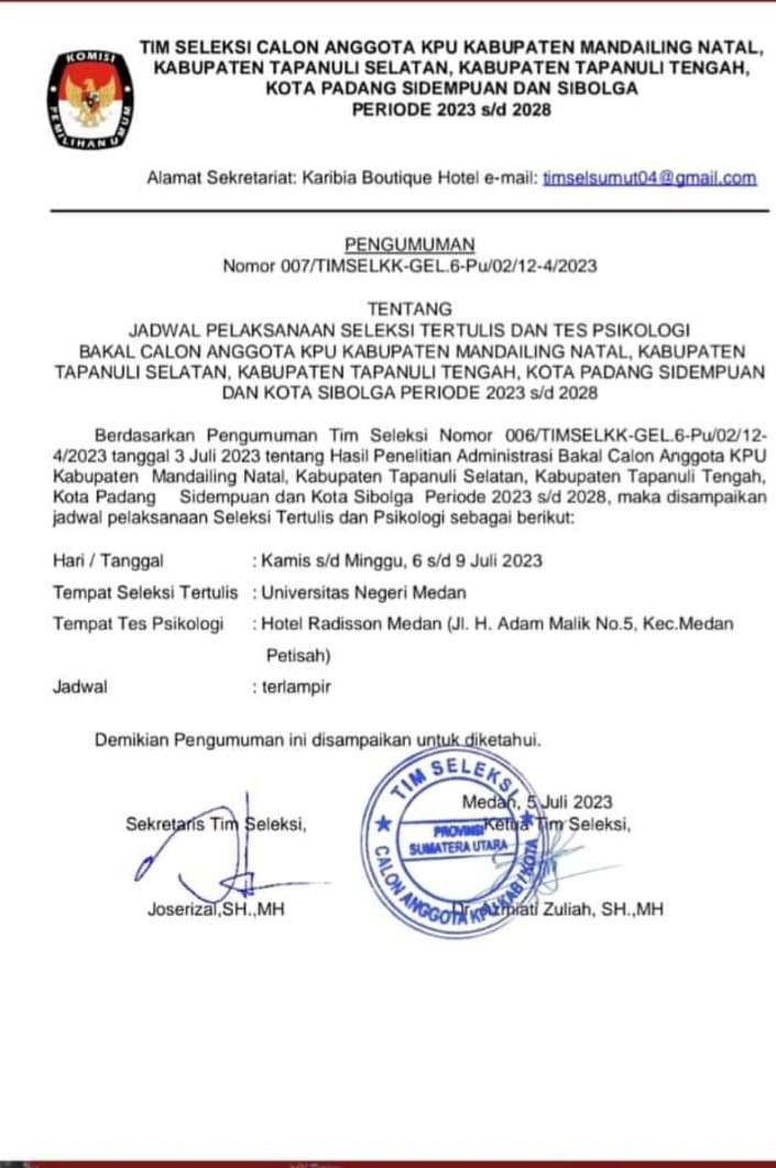 Pengumuman Jadwal Pelaksanaan Seleksi Tertulis dan Tes Psikologi Bakal Calon Anggota KPU Kota Padang Sidempuan Periode 2023 s/d 2028 Kamis, 06 Juli 2023 00:50 98 Pengumuman Nomor 007/TIMSELKK-GEL.6-Pu/02/12.4/2023 >>>klik disini Bagikan: Dilihat 98 Kali.