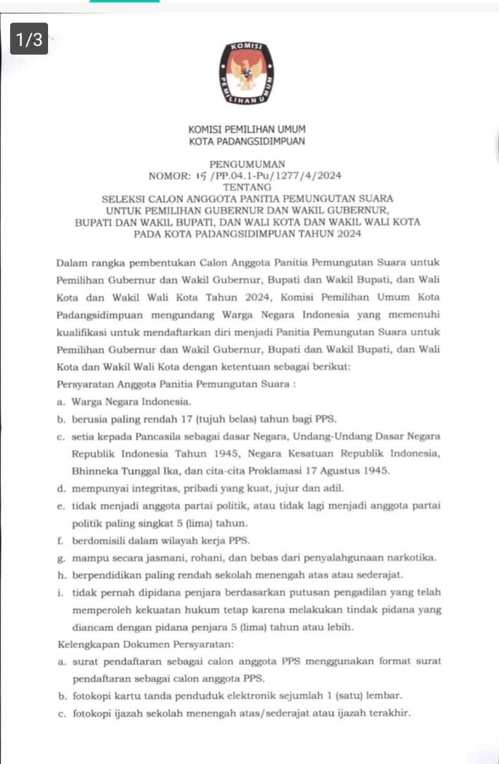 Pengumuman Seleksi Calon Anggota Panitia Pemungutan Suara untuk Pemilihan Gubernur dan Wakil Gubernur , Walikota dan Wakil Walikota Pada Kota Padangsidimpuan Tahun 2024