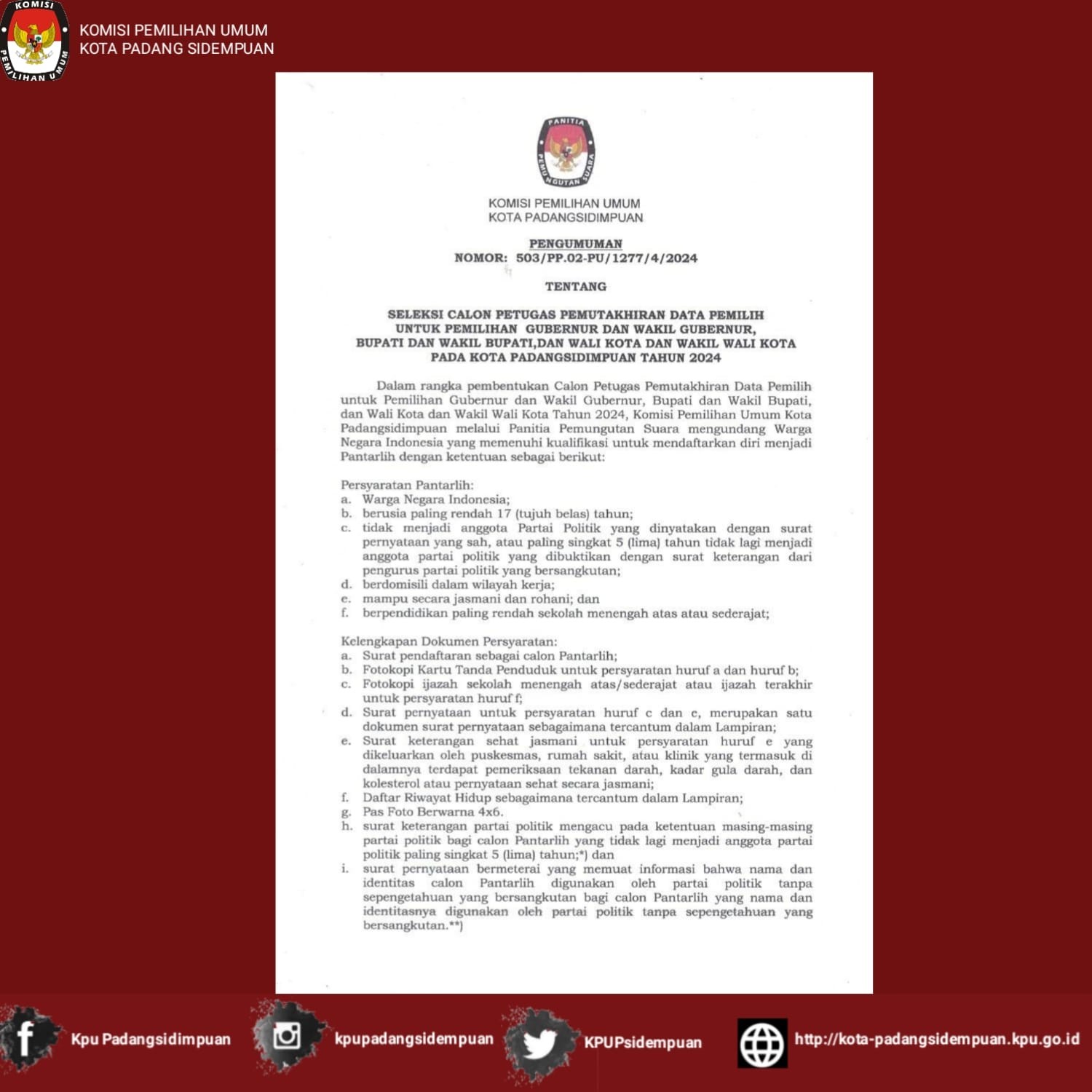#TemanPemilih, Berikut disampaikan Pengumuman Nomor: 503/PP.02-PU/1277/4/2024 tentang Seleksi Calon Petugas Pemutakhiran Data Pemilih Untuk Pemilihan Gubernur dan Wakil Gubernur, Bupati dan Wakil Bupati, dan Wali Kota dan Wakil Wali Kota pada Kota Padangsidimpuan Tahun 2024.