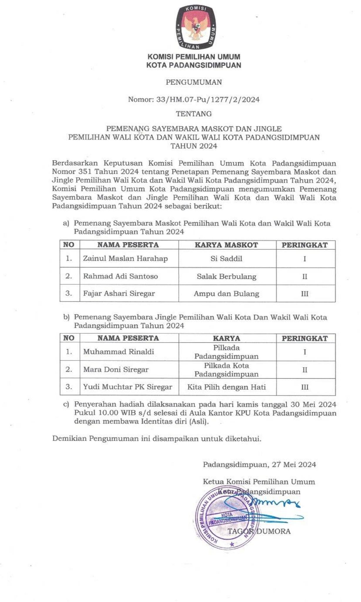 Pengumuman tentang Penetapan Pemenang Sayembara Maskot dan Jingle Pemilihan Walikota dan Wakil Walikota Padangsidimpuan Tahun 2024