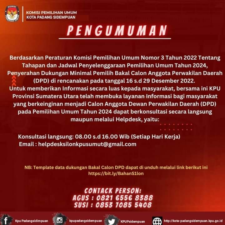 Untuk memberikan informasi secara luas kepada masyarakat, bersama ini KPU Provinsi Sumatera Utara telah membuka layanan informasi bagi masyarakat yang berkeinginan menjadi Calon Anggota Dewan Perwakilan Daerah (DPD) pada Pemilihan Umum Tahun 2024 dapat berkonsultasi secara langsung maupun melalui Helpdesk, yaitu: