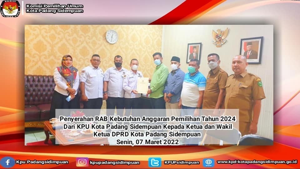 Komisioner KPU Kota Padang Sidempuan (Ketua dan Anggota) bersama Sekretaris KPU Kota Padang Sidempuan menyerahkan Salinan Rencana Anggaran Biaya (RAB) Kebutuhan Anggaran Pemilihan Kepala Daerah Kota Padang Sidempuan Tahun 2024 kepada Pimpinan DPRD Kota Padang Sidempuan yang diterima langsung oleh Ketua DPRD Kota Padang Sidempuan Siwan Siswanto, SH, Wakil Ketua Erwin Nasution, SH, MM dan Wakil Ketua Ir. Rusydi Nasution, MM