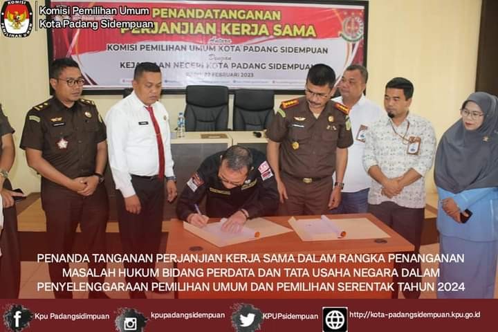 #TemanPemilih, Komisi Pemilihan Umum Kota Padang Sidempuan bersama Kejaksaan Negeri Kota Padang Sidempuan melakukan Penanda Tanganan Perjanjian Kerja Sama Dalam Rangka Penanganan Masalah Hukum Bidang Perdata dan Tata Usaha Negara Dalam Penyelenggaraan Pemilihan Umum dan Pemilihan Serentak Tahun 2024. Penanda Tanganan Perjanjian Kerja Sama ini dilaksanakan di Aula Kejari Kota Padang Sidempuan. Dalam Penanda Tanganan Kerja Sama ini KPU Kota Padang Sidempuan diwakili oleh Ketua KPU Kota Padang Sidempuan Tagor Dumora Lubis dan Kejaksaan Negeri Kota Padang Sidempuan diwakili oleh Kepala Kejari Kota Padang Sidempuan Jasmin Simanullang, SH, MH. Turut hadir dalam acara ini Komisioner, Sekretaris dan Staf Sekretariat KPU Kota Padang Sidempuan, Kasi Datun Kejari Kota Padang Sidempuan Manatap Sinaga, Kasi Pidsus Khairur Rahman Nasution dan pejabat lainnya di lingkungan Kejaksaan Negeri Padang Sidempuan, Rabu 22 Februari 2023