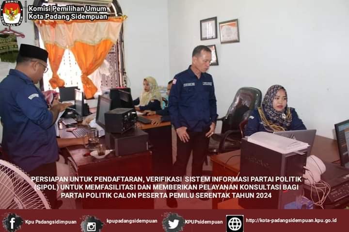 KPU Kota Padang Sidempuan melaksanakan persiapan untuk Verifikasi Administrasi Partai Politik Calon Peserta Pemilu Tahun 2024 dan Aktifasi Sistem Informasi Partai Politik (SIPOL) untuk memfasilitasi dan memberikan pelayanan konsultasi bagi Partai Politik calon Peserta Pemilu Serentak Tahun 2024. Waktu pelayanan pada hari Senin s.d. Minggu pukul 08.00- 17.00 WIB.