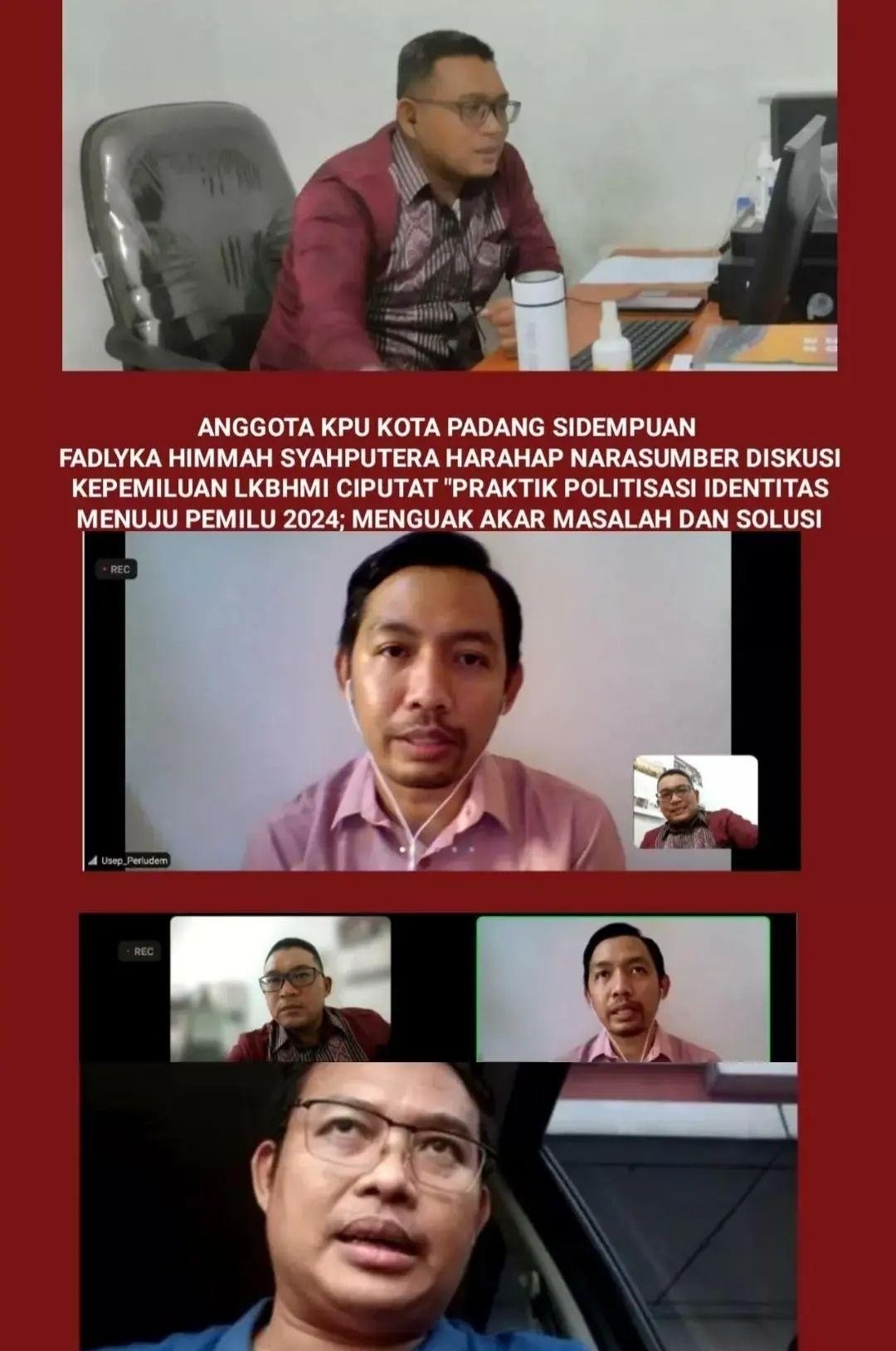 #TemanPemilih, Anggota KPU Kota Padang Sidempuan Fadlyka Himmah Syahputera Harahap menjadi nara sumber Webinar Zoom Lembaga Kajian dan Bantuan Hukum Mahasiswa Islam (LKBHMI) HMI Cabang Ciputat dengan tema Praktik Politisasi Indentitas Menuju Pemilu 2024; Menguak Akar Masalah dan Solusi Pemecahannya.