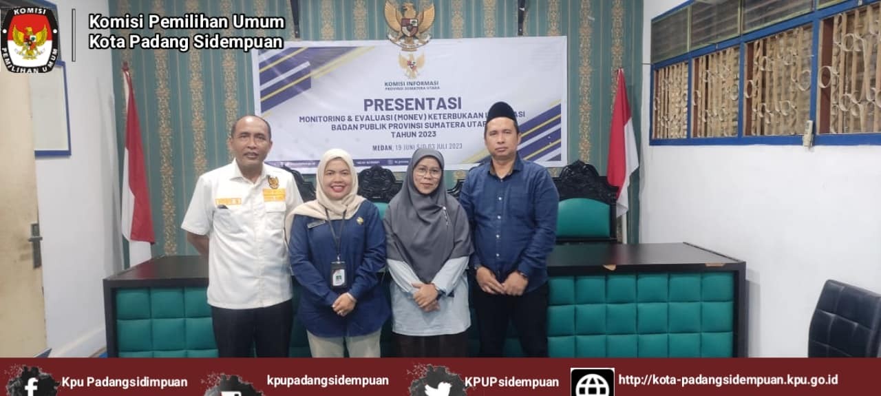 KPU Kota Padangsidimpuan melakukan presentasi monitoring dan evaluasi (monev) keterbukaan informasi Badan Publik Provinsi Sumatera Utara Tahun 2023 pada tanggal 4 Juli 2023 di Kantor Komisi Informasi (KI) Provinsi Sumatera Utara.