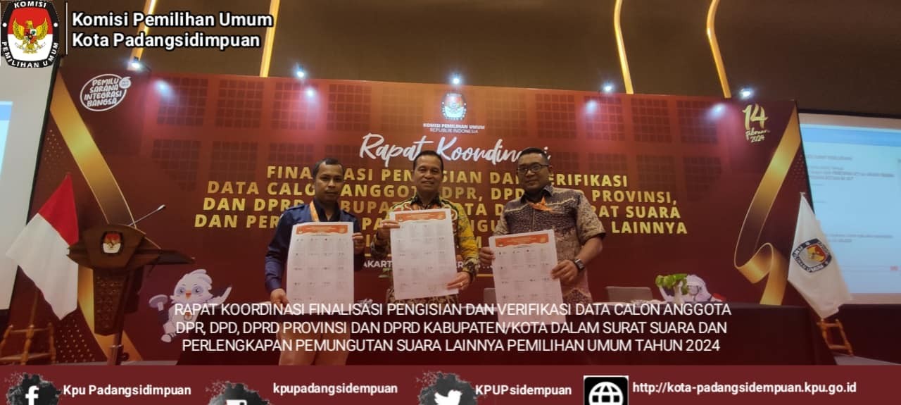 Ketua KPU Kota Padangsidimpuan Tagor Dumora Lubis bersama Ketua Divisi Teknis Penyelenggaraan Fadlyka Himmah Syahputera Harahap dan Operator Edy Wanra menghadiri Rapat Koordinasi Finalisasi Pengisian Dan Verifikasi Data Calon Anggota DPR, DPD, DPRD Provinsi dan DPRD Kabupaten/Kota Dalam Surat Suara Dan Perlengkapan Pemungutan Suara Lainnya Pemilihan Umum Tahun 2024.