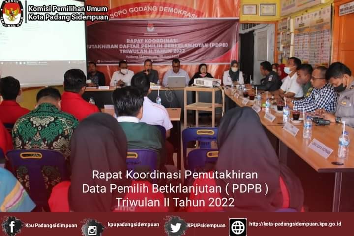Ketua dan seluruh Anggota KPU Kota Padang Sidempuan beserta Sekretaris, Kasubbag Proda dan admin/operator Sidalih KPU Kota Padang Sidempuan melaksanakan Rapat Koordinasi Daftar Pemilih Berkelanjutan (DPB) Triwulan Il Tahun 2022 dengan instansi terkait dan utusan partai politik se Kota Padang Sidempuan bertempat di Sopo Godang Demokrasi KPU Kota Padang Sidempuan.