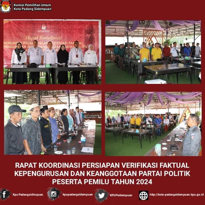 Senin 10 Oktober 2022 , Pukul 12.00 s/d selesai bertempat di Aula Cafe Yasto Padang Sidempuan, KPU Kota Padang Sidempuan melaksanakan Rapat Koordinasi Persiapan Verifikasi Faktual Kepengurusan dan Keanggotaan Partai Politik Peserta Pemilu Tahun 2024.