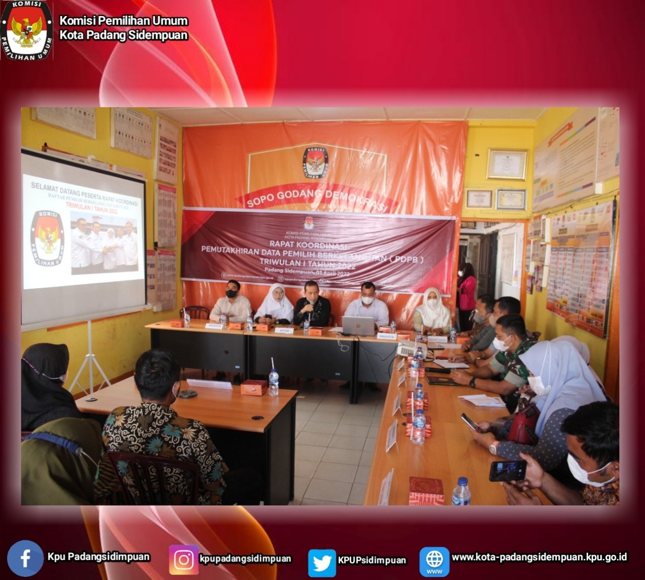 Ketua dan seluruh Anggota KPU Kota Padang Sidempuan beserta Sekretaris, Kasubbag Proda dan admin/operator Sidalih KPU Kota Padang Sidempuan melaksanakan Rapat Koordinasi Daftar Pemilih Berkelanjutan (DPB) Triwulan I Tahun 2022 dengan instansi terkait dan utusan partai politik se Kota Padang Sidempuan bertempat di Sopo Godang Demokrasi KPU Kota Padang Sidempuan.