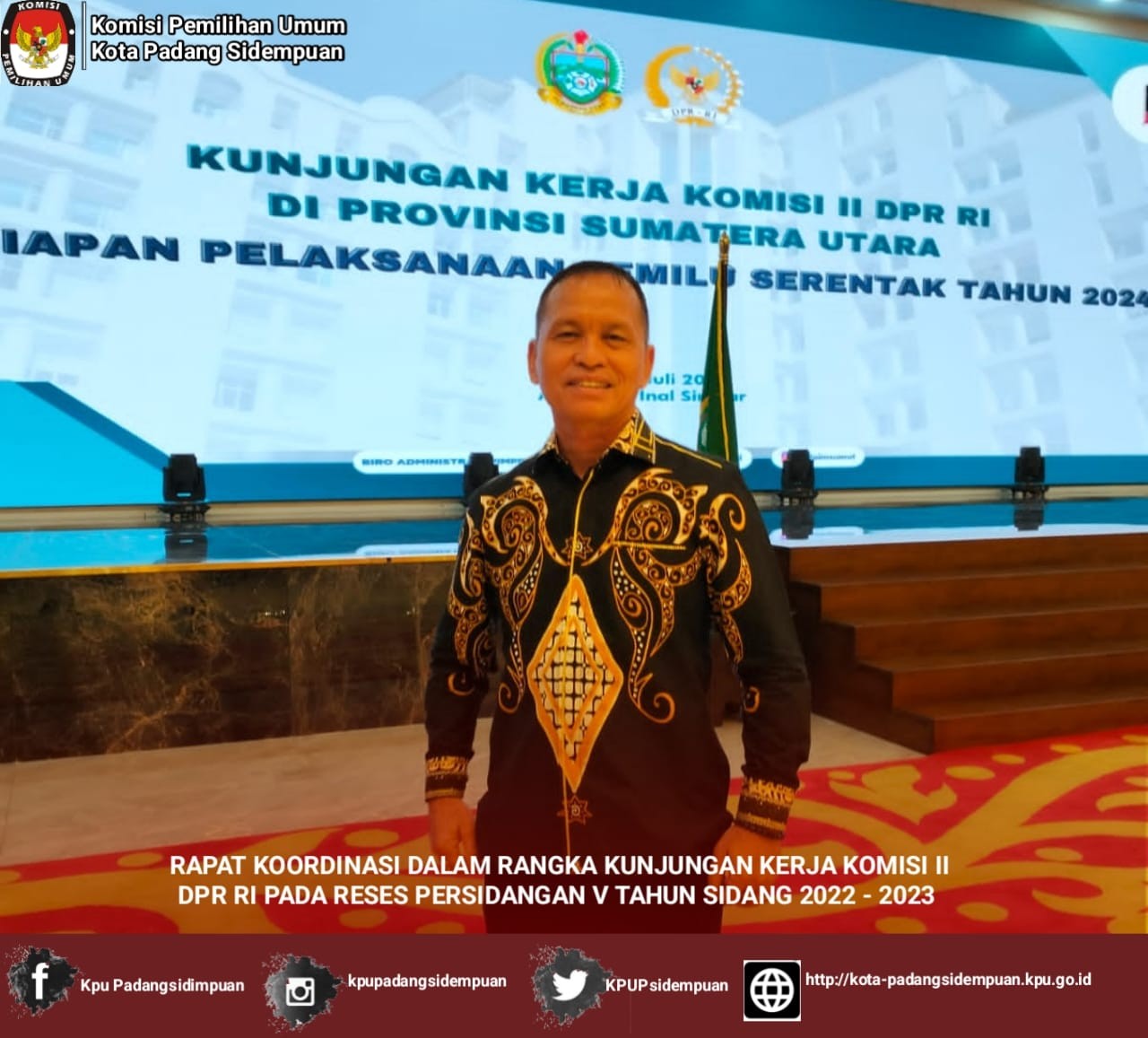 #Teman Pemilih, Ketua KPU Kota Padangsidimpuan Tagor Dumora Lubis menghadiri Acara Rapat Koordinasi Dalam Rangka Kunjungan Kerja Komisi II DPR RI Pada Reses Persidangan V Tahun Sidang 2022 - 2023 di Kantor Gubernur Sumatera Utara. Rapat Koordinasi ini dihadiri oleh : Ketua dan Anggota Komisi II DPR RI, Gubernur Sumatera Utara, Pangdam I BB, Kapolda Sumatera Utara, Kajari Sumatera Utara, Kepala Dinas/Badan Kesbangpol, Kominfo, Keuangan dan Aset Daerah, Pemberdayaan Masyarakat dan Desa, Kependudukan dan Catatan Sipil Provinsi Sumatera Utara, Ketua KPU Provinsi Sumatera Utara, Ketua KPU Kabupaten/Kota seSumatera Utara, Ketua Bawaslu Provinsi Sumatera Utara dan Ketua Bawaslu Kabupaten/Kota seSumatera Utara. Ketua Komisi II DPR RI Ahmad Doli Kurnia Tanjung dalam sambutannya menyampaikan bahwa pentingnya Persiapan Provinsi Sumatera Utara dalam menghadapi Pemilihan Umum Serentak Tahun 2024 begitu juga dengan Pemilihan Kepala Daerah Serentak Secara Nasional Tahun 2024, Medan 24 Juli 2023.