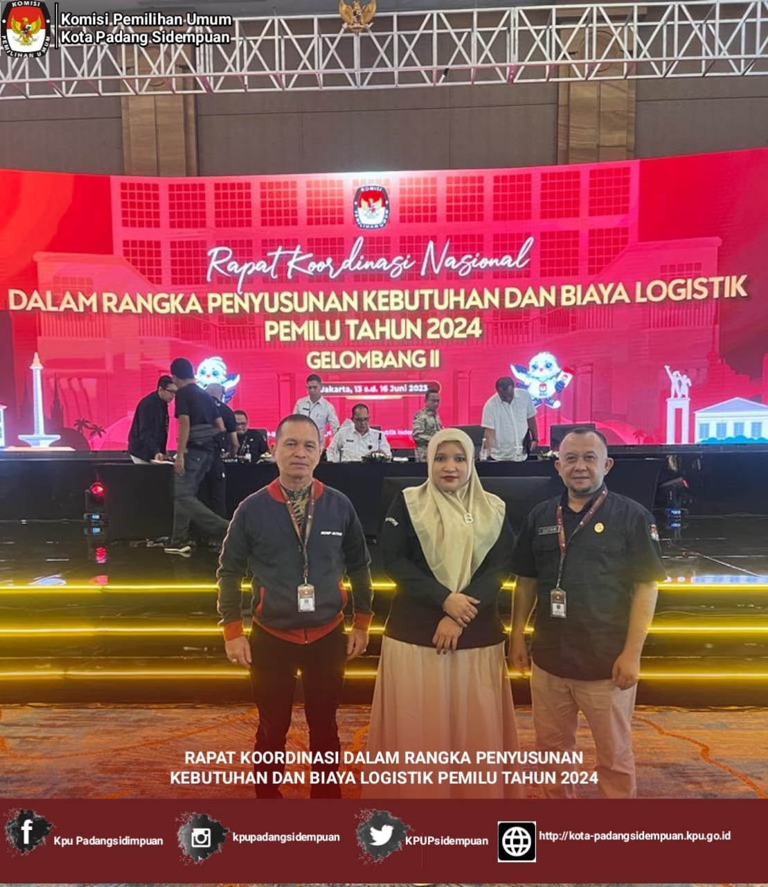 #TemanPemilih, Ketua KPU Kota Padangsidimpuan Tagor Dumora bersama Sekretaris KPU Kota Padangsidimpuan Deka Ria Murti Lubis, Kasubbag Keuangan Umum dan Logistik KPU Kota Padangsidimpuan Sutan menghadiri Acara Rapat Koordinasi Nasional Dalam Rangka Penyusunan Kebutuhan Dan Biaya Logistik Pemilu Tahun 2024. Pada kesempatan ini peserta Rakornas Logistik Gelombang kedua yang terdiri dari 13 KPU Provinsi dengan seluruh KPU Kabupaten/Kotanya telah menyampaikan beberapa rekomendasi kepada KPU RI diantaranya terkait Sarana Kebutuhan Gudang Logistik yang Representatif dan Kelancaran Pendistribusian Logistik dengan mengevaluasi ketersediaan anggaran yang ada. Rakornas Logistik ini telah berakhir dan ditutup secara resmi oleh Ketua KPU RI Hasyim Asy'ari, Pullman Hotel Jakarta 13 s/d 16 Juni 2023.