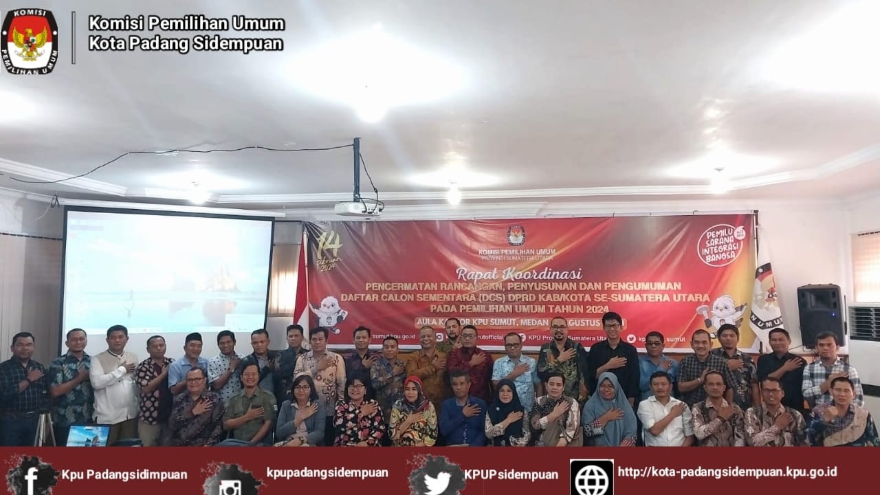KPU Kota Padang Sidempuan mengikuti Rapat Koordinasi Pencermatan Rancangan, Penyusunan dan Pengumuman Daftar Calon Sementara (DCS) DPRD Kab/Kota Se-Sumatera Utara pada Pemilu Tahun 2024 yang dilaksanakan di Aula KPU Provinsi Sumatera Utara, Jum'at, 4 Agustus 2023.