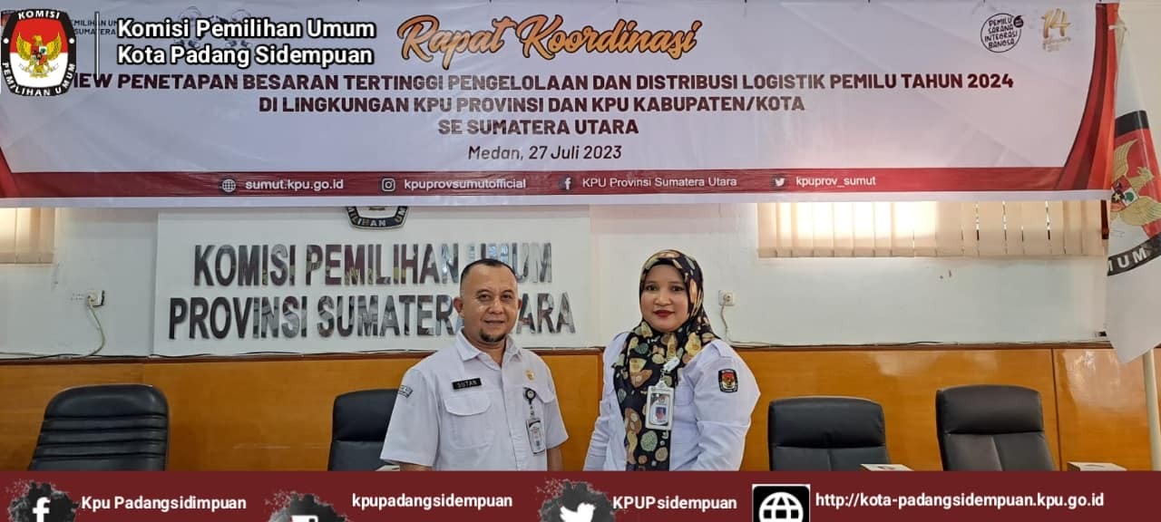 #TemanPemilih, dalam rangka melakukan review Penetapan Besaran Biaya Pengelolaan dan Distribusi Logistik Pemilu Tahun 2024 dengan BPKP Perwakilan Provinsi Sumatera Utara, Sekretaris KPU Kota Padangsidimpuan Deka Ria Murti Lubis bersama Kasubnag Keuangan, Umum dan Logistik Sutan Lubis mengikuti Rapat Koordinasi dengan mengundang KPU Kabupaten/Kota Se-Sumatera Utara pada hari Kamis, tanggal 27 Juni 2023 mulai pukul 09.00 WIB s/d selesai di Aula Kantor KPU Provinsi Sumatera Utara.