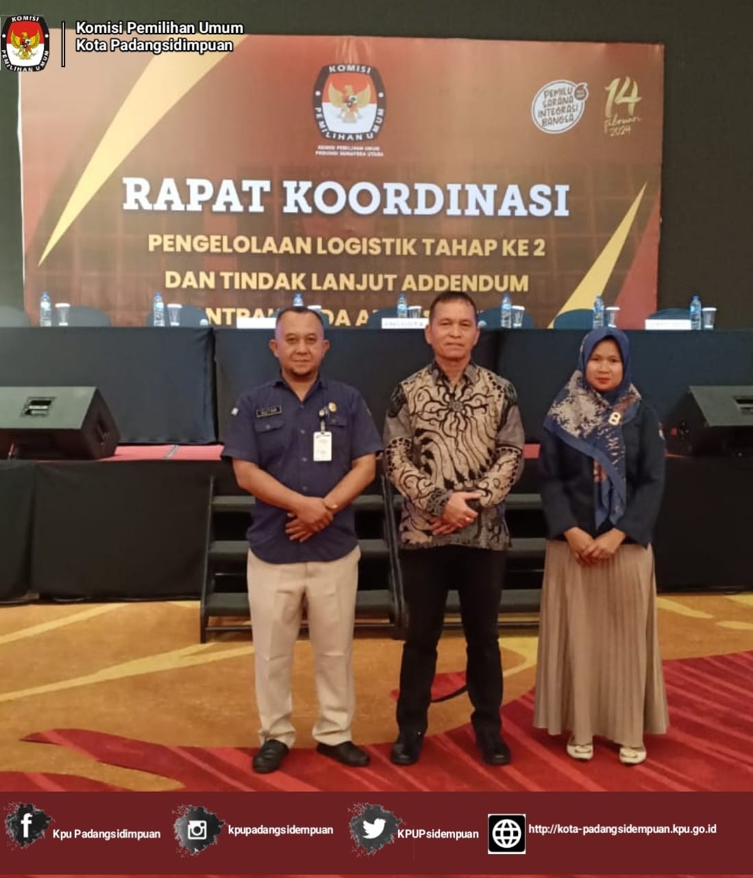 #TemanPemilih, Ketua KPU Kota Padangsidimpuan bersama Kasubbag KUL Sutan dan Operator Silog KPU Kota Padangsidimpuan Asrina Juliati mengikuti "Rapat Koordinasi Pengelolaan Logistik Tahap ke 2 dan Tindak Lanjut Addendum Kontrak Pada Silog" yang diselenggarakan oleh KPU Provinsi Sumatera Utara. Rapat Koordinasi Pengelolaan Logistik Tahap ke 2 dan Tindak Lanjut Addendum Kontrak Pada Silog dihadiri oleh : Ketua KPU Provinsi Sumatera Utara Agus Arifin bersama Anggota KPU Provinsi Sumatera Utara Kotaris Banurea dan El Suhaimi, Sekretaris KPU Provinsi Sumatera Utara Safran Daulay beserta jajaran Sekretariat KPU Provinsi Sumatera Utara, Ketua bersama Sekretaris, Kasubbag KUL dan Admin/Operator Silog KPU Kabupaten/Kota se Sumatera Utara. Pengelolaan Logistik harus dilakukan secara optimal baik pada tahap perencanaan kebutuhan dan penganggarannya, pengadaan, pendistribusian serta pemeliharaan dan inventarisasi dengan memperhatikan prinsip tepat waktu, tepat jenis, tepat sasaran, tepat jumlah, tepat kualitas, efisien dan efektif, JW Marriot 16 s/d 17 Desember 2023.