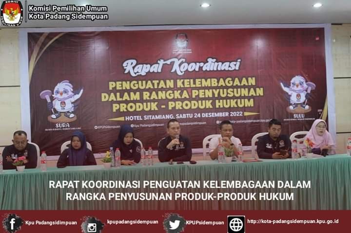#TemanPemilih, KPU Kota Padang Sidempuan melaksanakan Rapat Koordinasi Penguatan Kelembagaan Dalam Rangka Penyusunan Produk-Produk Hukum yang dilaksanakan di Hotel Sitamiang Kota Padang Sidempuan pada hari Sabtu, 24 Desember 2022.
