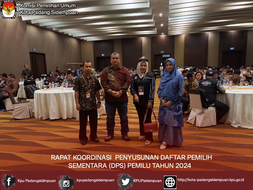 Ketua Divisi Perencanaan Data dan Informasi Afwan Hasibuan bersama Kasubbag Perencanaan Data dan Informasi Suryani Ramlah dan Operator Sidalih Edi Wanra KPU Kota Padang Sidempuan mengikuti Rapat Koordinasi Penyusunan Daftar Pemilih Sementara (DPS) Pemilu Tahun 2024 yang dilaksanakan oleh KPU Provinsi Sumatera Utara, bertempat di Hotel Santika Dyandra Medan.