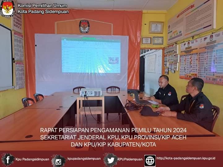 #TemanPemilih, Dalam rangka Rapat Persiapan Pengamanan Pemilu Tahun 2024 Sekretariat Jenderal KPU, KPU Provinsi/KIP Aceh dan KPU/KIP Kabupaten/Kota, Kasubbag Umum KPU Kota Padang Sidempuan (Sutan) bersama Jagat Saksana KPU Kota Padang Sidempuan (Syafar Mulia) mengikuti Rapat Persiapan Pengamanan Pemilu Tahun 2024 Sekretariat Jenderal KPU, KPU Provinsi/KIP Aceh dan KPU/KIP Kabupaten/Kota yang dilaksanakan secara daring oleh KPU Republik Indonesia secara daring pada hari Rabu, 04 Januari 2023 pada pukul 09:00 WIB.