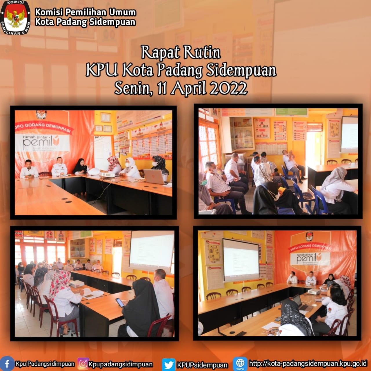#TemanPemilih, Komisi Pemilihan Umum Kota Padang Sidempuan melaksanakan rapat pleno rutin yang di hadiri oleh Ketua KPU Kota Padang Sidempuan Tagor Dumora Lubis, SH, Ketua Divisi Hukum dan Pengawasan Ahmad Rasid, S.Pd, Ketua Divisi Sosialisasi Pendidikan Pemilih dan Parmas Dr. Nurhamidah Pulungan, SE, S.Pd, MM, Sekretaris KPU Kota Padang Sidempuan Deka Ria Murti Lubis, SH, Kasubbag Teknis Annur Rasyidah Siregar, S. Pt, Kasubbag Perencanaan Data dan Informasi Suryani Ramalh, SE.