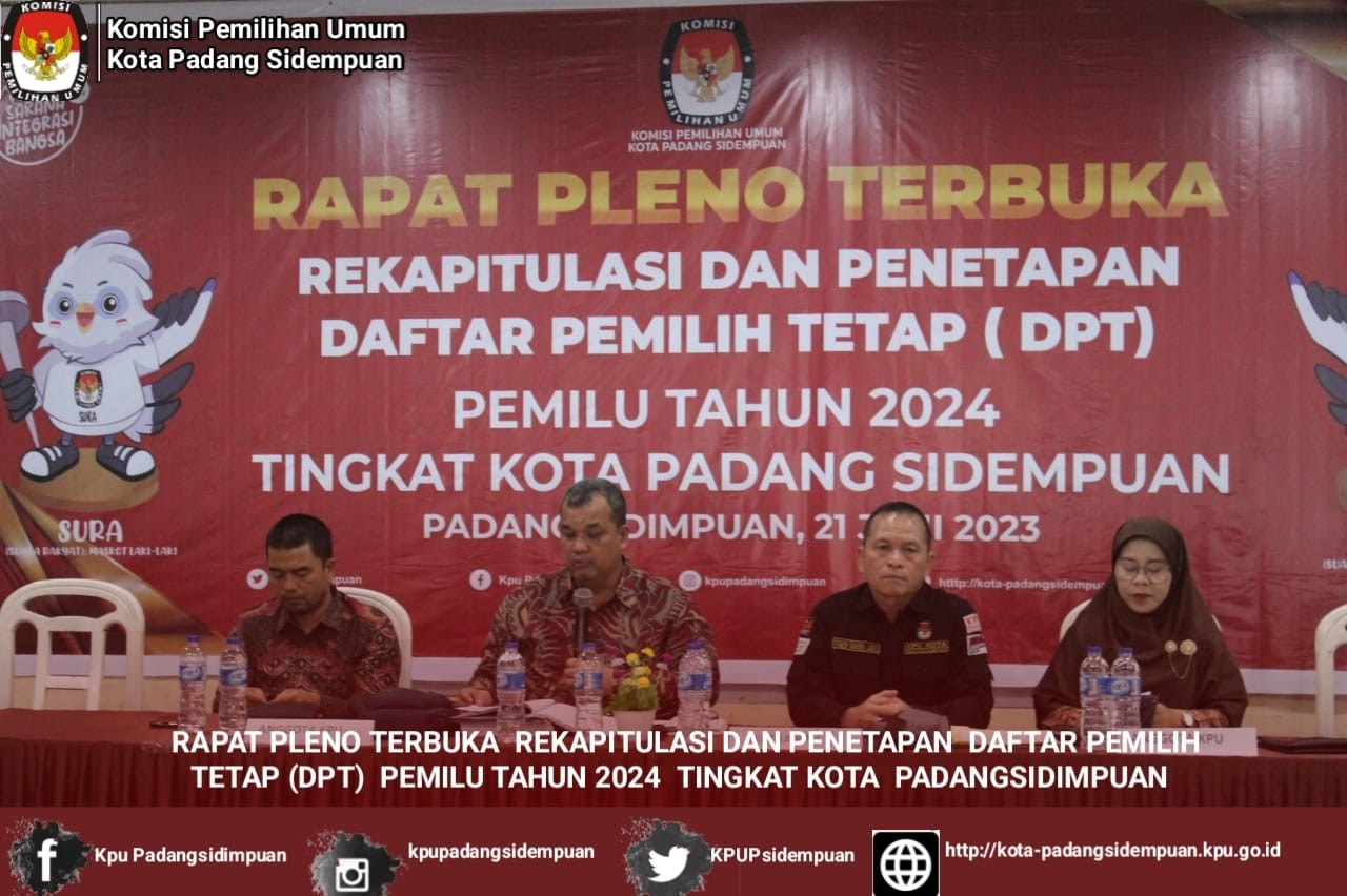 #TemanPemilih, Berdasarkan Peraturan Komisi Pemilihan Umum Nomor 7 tahun 2023 tentang Perubahan Atas Peraturan Komisi Pemilihan Umum Nomor 7 tahun 2022 tentang Penyusunan Daftar Pemilih dalam Penyelenggaraan Pemilihan Umum dan Sistem Informasi Data Pemilih dan Keputusan Komisi Pemilihan Umum Nomor 27 tahun 2023 tentang Pedoman Teknis Penyusunan Daftar Pemilih Dalam Negeri pada Penyelenggaraan Pemilu tahun 2024, Komisi Pemilihan Umum Kota Padangsidimpuan melaksanakan Rapat Pleno Terbuka Rekapitulasi dan Penetapan Daftar Pemilih Tetap (DPT) Pemilu Tahun 2024 Tingkat Kota Padangsidimpuan yang dilaksanakan pada hari Rabu, 21 Juni 2023 bertempat di Hotel Sitamiang Kota Padangsidimpuan.